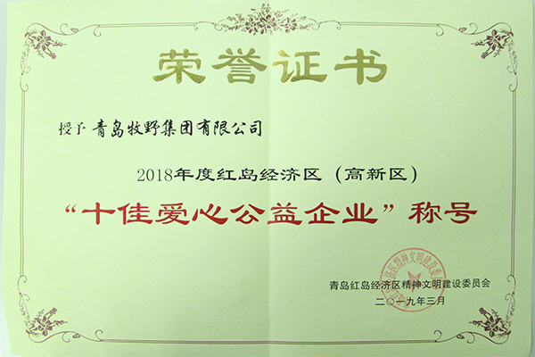Qingdao Muye Group Co., Ltd. was awarded the title of “Top Ten Love Public Welfare Enterprise” in Hongda Economic Zone (High-tech Zone) in 2018